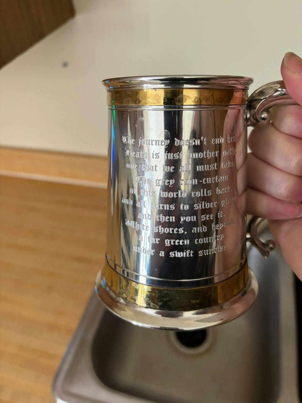 1 pint medium weight monarch pewter tankard with double brass bands.